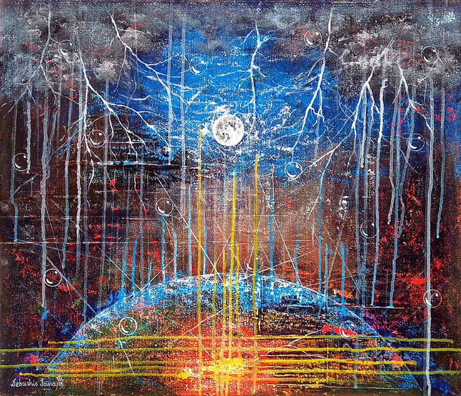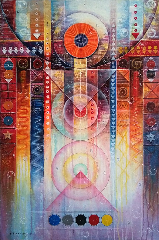 Representation of nature: Nature emerges from an invisible vibration—where solar particles remain still, and light, heat, and sound unite to illuminate and reflect the fundamental force of existence; these elements are not merely physical, rather they are the silent echoes of the supreme being, resonating deep within consciousness; as this light spreads throughout the universe, it initiates the evolution of the solar system; through the combined formation of the Earth and Moon, nature attains a distinct structure, where the rhythm of rotation and orbit sustains the potential for life;
